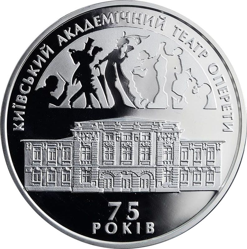 Описание: На монеті зображено фасад театральної будівлі разом із силуетами персонажів оперети, скопійованими зі старих театральних афіш (над будівлею), а також написи КИЇВСЬКИЙ АКАДЕМІЧНИЙ ТЕАТР ОПЕРЕТИ (Київський академічний театр оперети) (вгорі, напівкругло) та 75/РОКІВ (75/років) внизу.