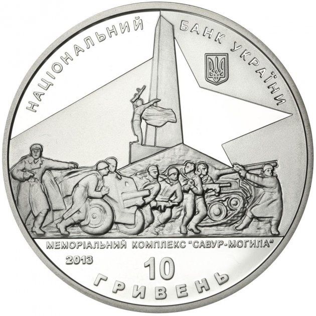Описание: Зверху розміщено напівкруглий напис НАЦІОНАЛЬНИЙ БАНК УКРАЇНИ (Національний банк України) з малим гербом України під ним праворуч; у центрі зображено меморіал воїнам-визволителям, під яким розміщено назву МЕМОРІАЛЬНИЙ КОМПЛЕКС «САВУР-МОГИЛА»; нижче вказано рік випуску монети 2013 (зліва) та номінал: 10/ГРИВЕНЬ (10 гривень).