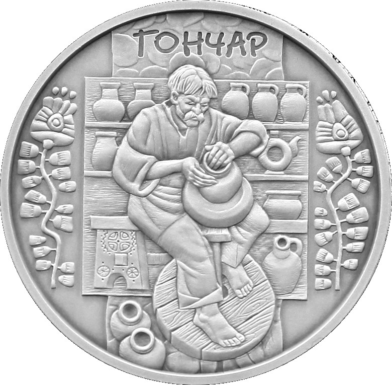 Описание: На монеті зображено гончара за роботою на тлі стилізованих гончарних виробів. Зверху розміщено напис ГОНЧАР. Ліворуч і праворуч від центральної композиції розміщено орнаментальні квіткові візерунки.