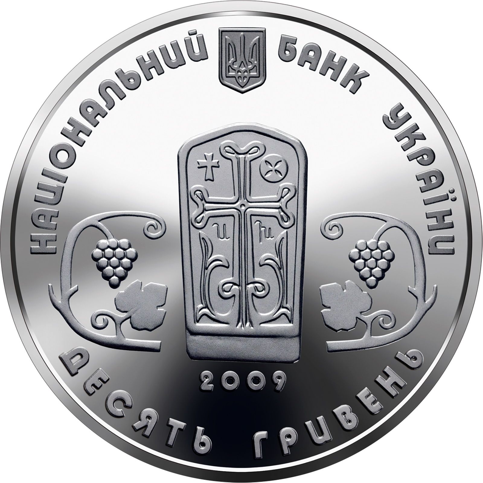 Описание: Мала державна емблема України та напис по колу: НАЦІОНАЛЬНИЙ БАНК УКРАЇНИ (Національний банк України); у центрі – хачкар (хрест-камінь), що знаходиться на території монастиря, прикрашений рослинним орнаментом, нижче – рік випуску монети – 2009 та номінал ДЕСЯТЬ ГРИВЕНЬ (десять гривень).