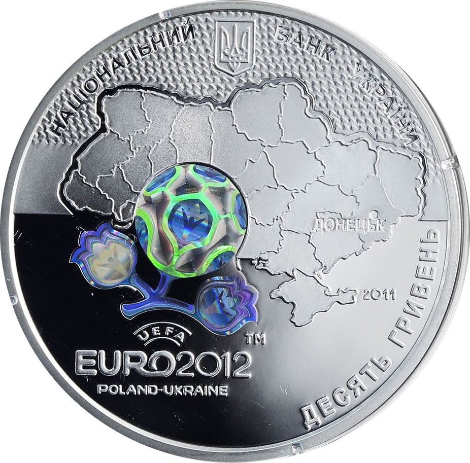 Описание: Зверху — малий герб України з напівкруглим написом НАЦІОНАЛЬНИЙ БАНК УКРАЇНИ (Національний банк України); на тлі карти України з написом ДОНЕЦЬК (Донецьк) розміщено голографічне зображення офіційного логотипу UEFA Euro 2012 з написами під ним UEFA/EURO 2012TM/POLAND-UKRAINE; праворуч — рік випуску монети 2011 та номінал у вигляді стрічки ДЕСЯТЬ ГРИВЕНЬ (десять гривень).