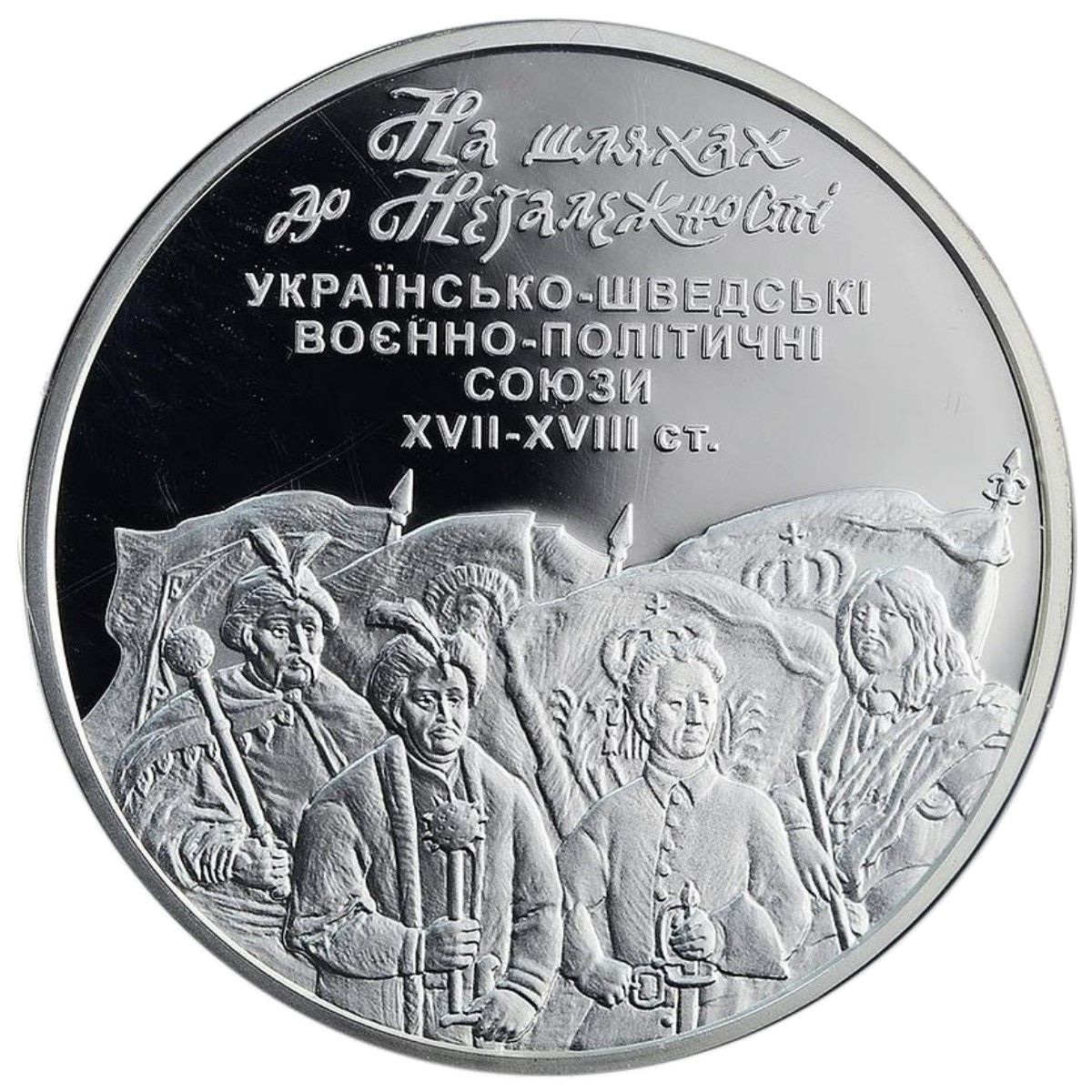 Описание: На тлі прапорів зображені портрети найвизначніших осіб відповідного історичного періоду — гетьманів Богдана Хмельницького та Івана Мазепи, королів Карла XII та Карла X Густава (зліва направо).