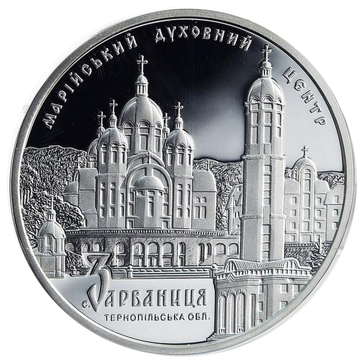Описание: На монеті зображено вражаючий архітектурний ансамбль собору Матері Божої Зарваницької з дзвіницею та написами: МАРІЙСЬКИЙ ДУХОВНИЙ ЦЕНТР (Духовний центр Марії), напівкруглий зверху, та с. ЗАРВАНИЦЯ/ТЕРНОПІЛЬСЬКА ОБЛ. (село Зарваниця / Тернопільська область) внизу.