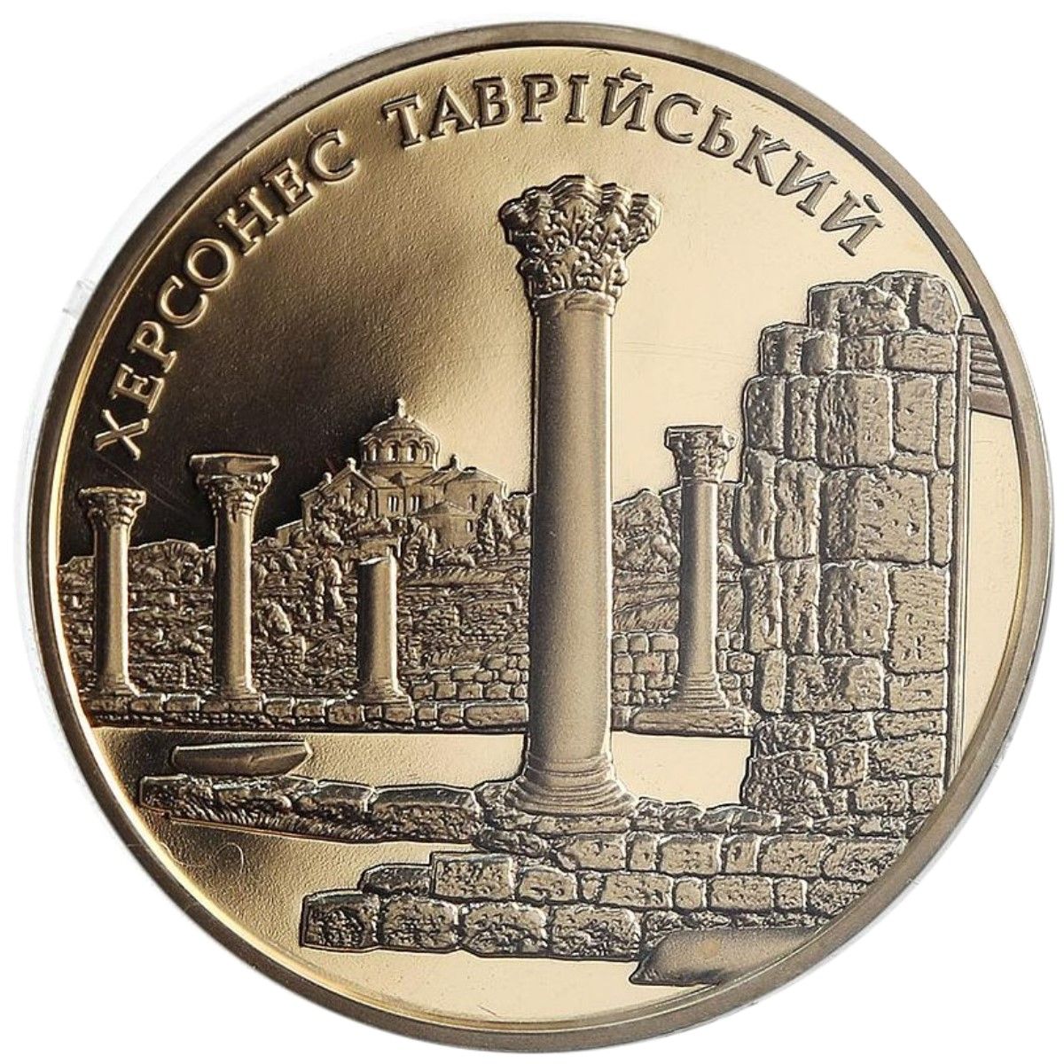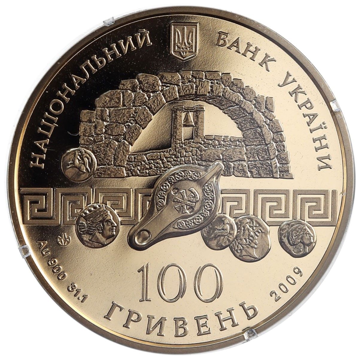 Описание: Вверху находится малый герб Украины, полукруглая надпись НАЦІОНАЛЬНИЙ БАНК УКРАЇНИ (Национальный банк Украины), внизу — номинал монеты 100/ГРИВЕНЬ (100 гривен), обозначение металла и его пробы Au 900, вес в пробе 31,1 и год выпуска монеты 2009 справа, в центре монеты, вверху изображен фрагмент древнего сооружения и сигнальная колокольня, внизу, на фоне меандра, древние монеты Херсонеса и лампа (V-VI вв. н.э.).