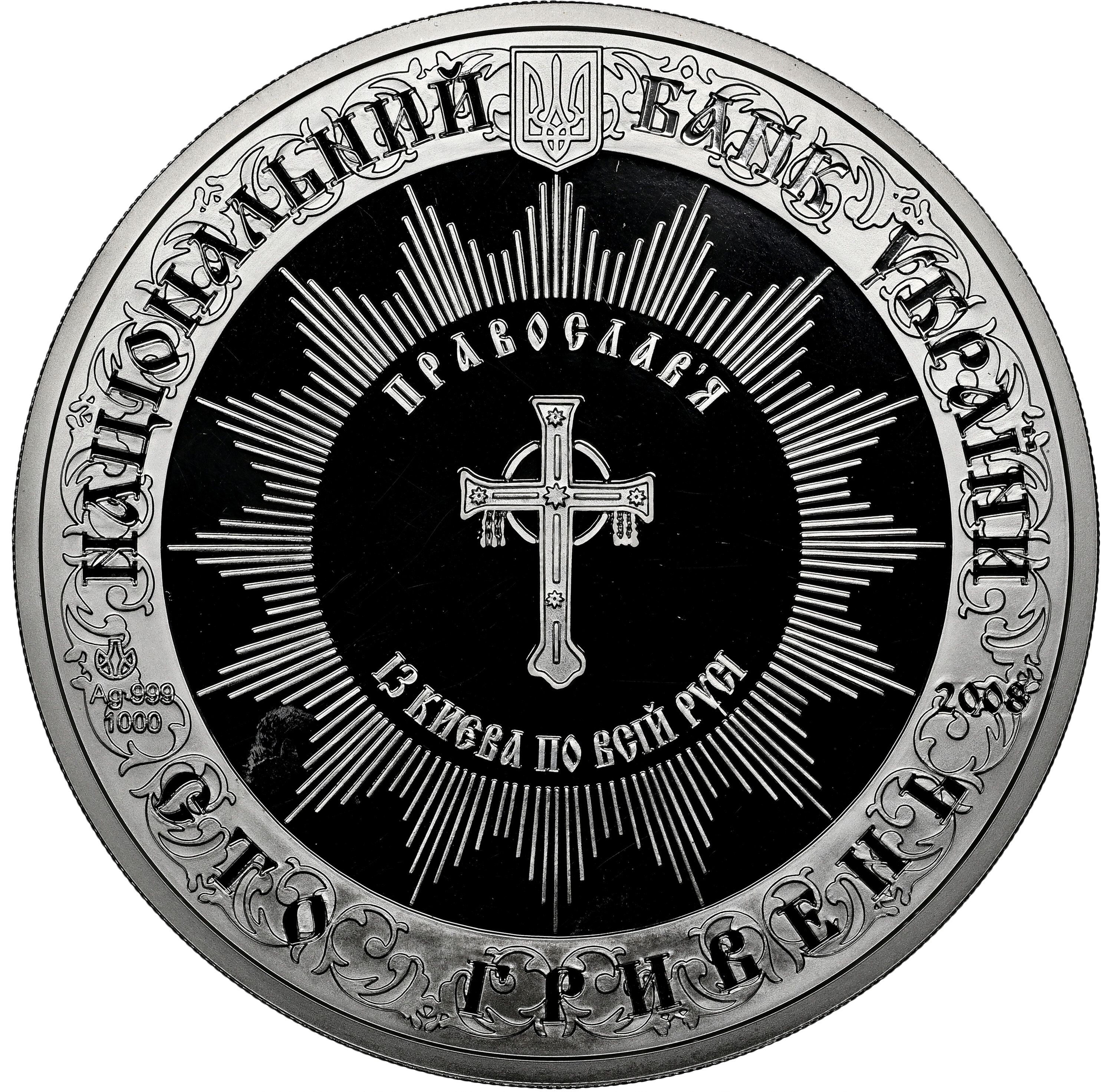 Описание: На тлі стилізованого орнаменту розміщено малий герб України та кругові написи НАЦІОНАЛЬНИЙ БАНК УКРАЇНИ (Національний банк України) (зверху) і СТО ГРИВЕНЬ (сто гривень) (знизу), між ними — рік випуску монети 2008 (праворуч), позначення металу та його проби – Ag 999, вага в пробі – 1000, а також логотип Монетного двору Національного банку України (зліва). У центрі монети в колі стилізованих променів зображено хрест і напівкруглі написи ПРАВОСЛАВ’Я (православ’я (зверху) та ІЗ КИЄВА ПО ВСІЙ РУСІ (з Києва по всій Русі (знизу).