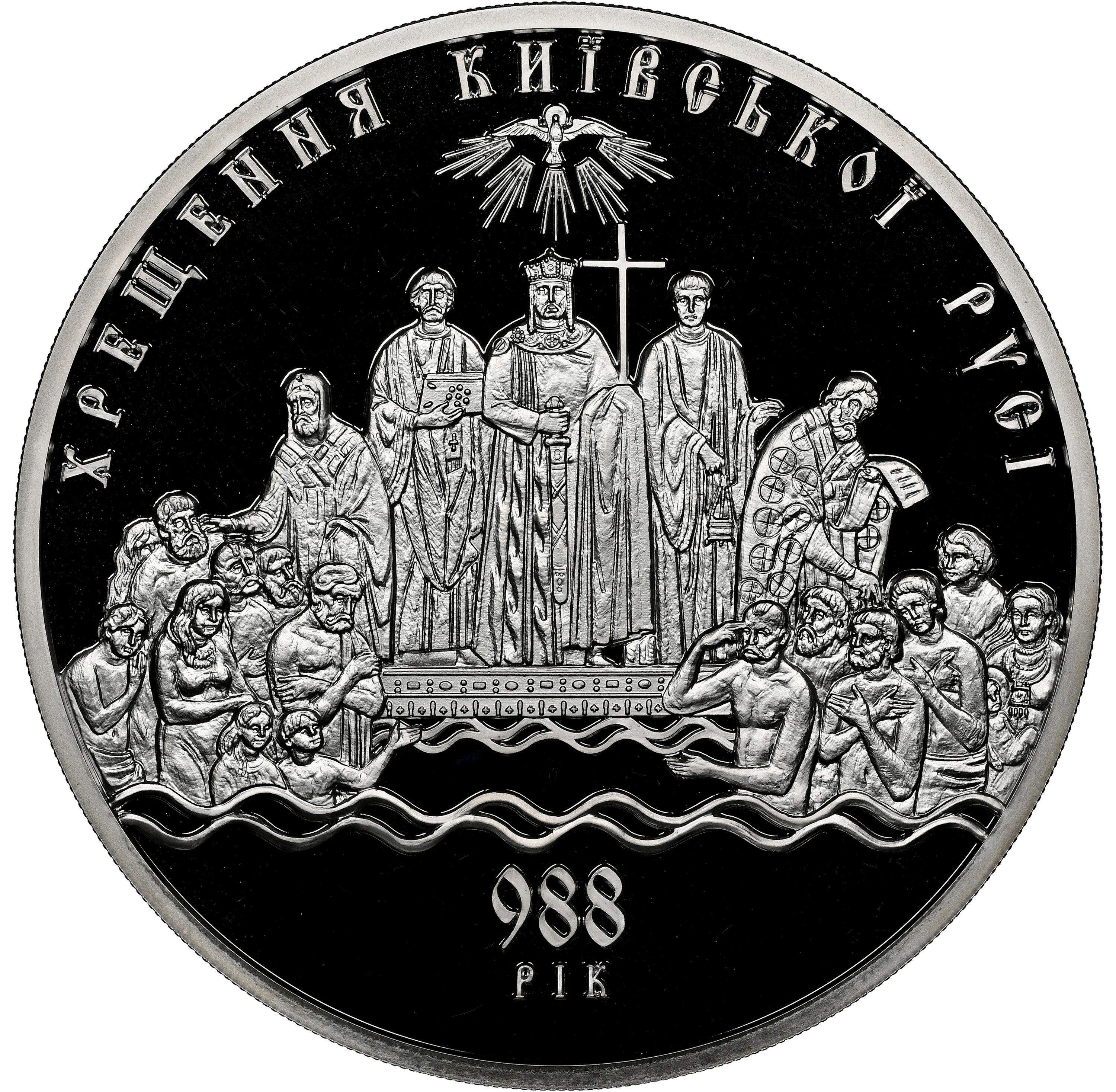 Описание: На монеті зображено багатофігурну композицію хрещення з написом 988/РІК (988/YEAR) внизу та напівкруглим написом – ХРЕЩЕННЯ КИЇВСЬКОЇ РУСІ (Christianization of Kievan Rus) вгорі.