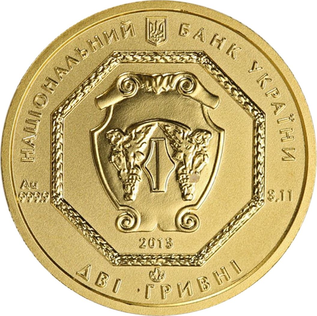 Описание: Зверху розміщено малий герб України з напівкруглим написом НАЦІОНАЛЬНИЙ БАНК УКРАЇНИ (Національний банк України), у центрі монети, в восьмикутному картуші, зображено щит з емблемою Національного банку України — алегоричними фігурами грифонів, між якими розміщена гривня (грошова одиниця Київської Русі). Ця емблема символізує збереження та збільшення золотих запасів країни. На аверсі монети вказано номінал монети, рік випуску монети, а також позначення металу та його проби і вагу монети в пробі.