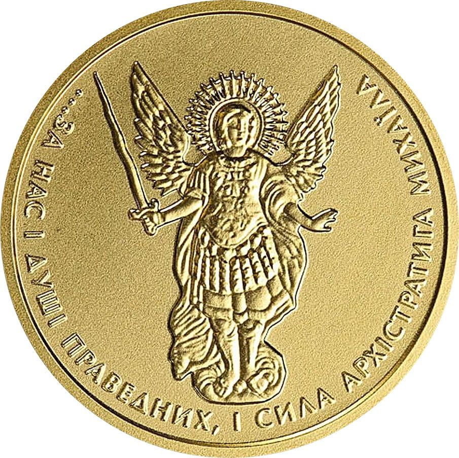 Описание: На монеті зображений архангел Михаїл (православ'я надає йому титул «архістратиг»), один з найшанованіших біблійних персонажів, відомий перемогою над злом і покровителем воїнів, хворих і стражденних; є круговий напис: …ЗА НАС І ДУШІ ПРАВЕДНИХ, І СИЛА АРХІСТРАТИГА МИХАЇЛА/ ЗА НАС І ДУШІ ПРАВЕДНИХ, І СИЛА АРХІСТРАТЕГА МИХАЇЛА (рядки з «Гайдамаків» Т. Шевченка).