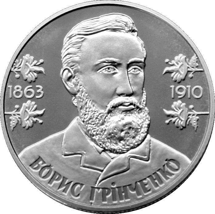 Описание: Зліва та справа від портрета Бориса Грінченка у квітковому орнаменті вказані роки його життя 1863 та 1910; нижче розміщено напис БОРИС ГРІНЧЕНКО (Borys Hrinchenko).
