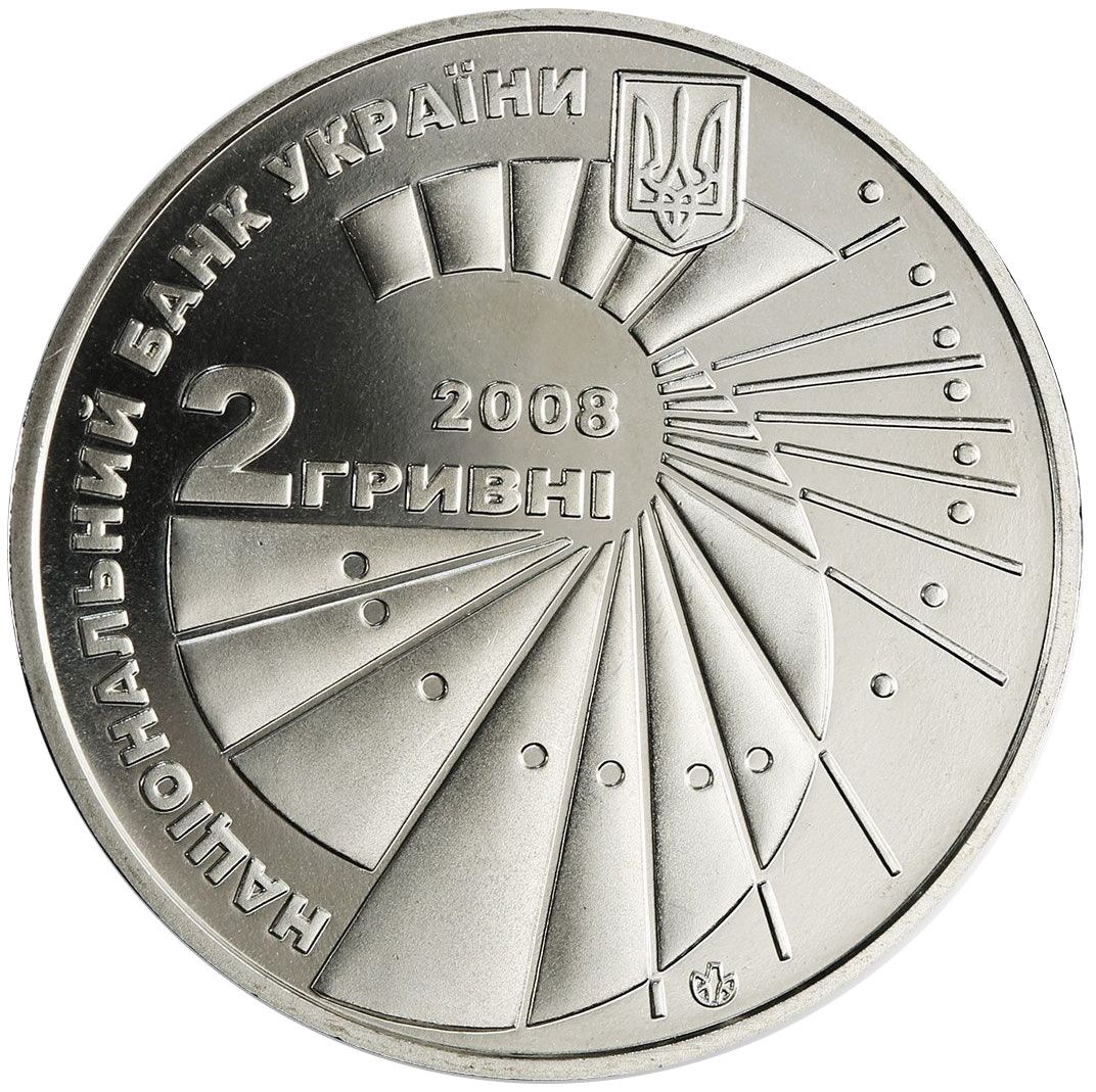Описание: Изображение Вороного диаграммы; малый герб Украины (вверху); надписи «2008/2 ГРИВНІ» (2008/2 гривны), полукруглая надпись «НАЦІОНАЛЬНИЙ БАНК УКРАЇНИ» (Национальный банк Украины) слева и логотип Монетного двора Национального банка Украины.