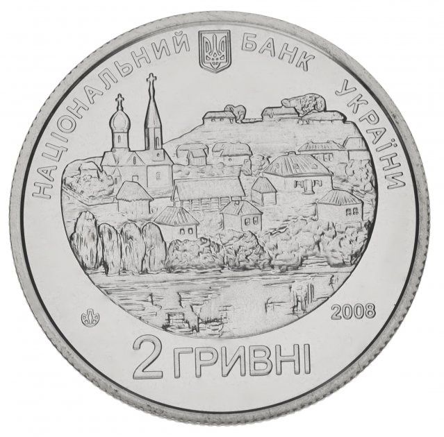 Описание: Изображены: вверху — малый государственный герб Украины и полукруглая надпись «Національний банк України» (Национальный банк Украины), городской пейзаж, типичный для Восточной Украины XIX века; внизу — надпись «2/ГРИВНІ (2/гривны), год выпуска монеты 2008 (справа) и логотип Монетного двора Национального банка Украины (слева).