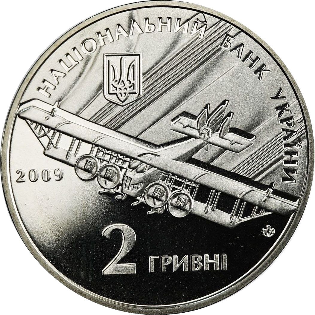 Описание: Изображены: самолет Ильи Муромца, благодаря разработке которого в 1913 году Сикорский стал известен во всем мире; вверху, на рельефном фоне, полукруглая надпись «Національний банк України» (Национальный банк Украины) и под ней малый герб Украины, внизу — год выпуска монеты 2009, номинал 2 ГРИВНІ (2 гривны) и логотип Монетного двора Национального банка Украины.