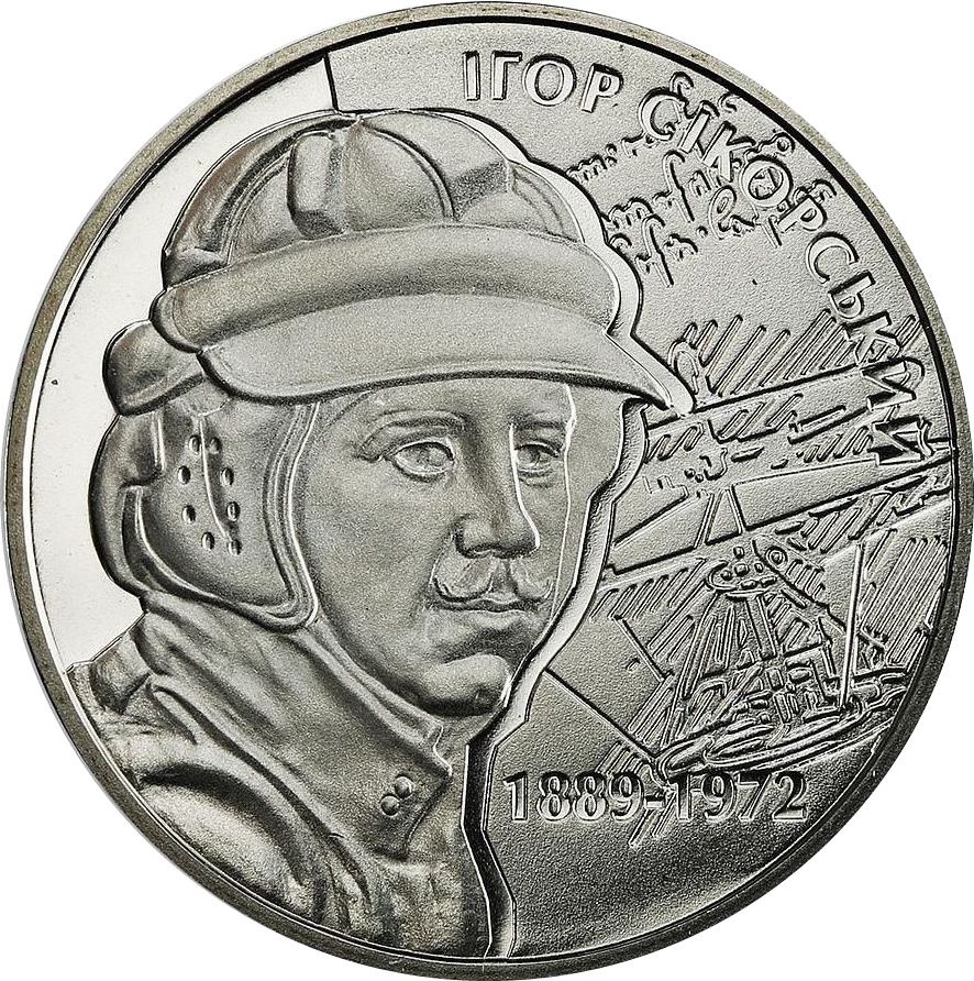 Описание: На монете изображен портрет Сикорского в форме летчика; справа, на фоне рисунка Леонардо да Винчи, находится надпись в форме дуги: ІГОР СІКОРСЬКИЙ (Игорь Сикорский) с указанием лет его жизни: 1889-1972.