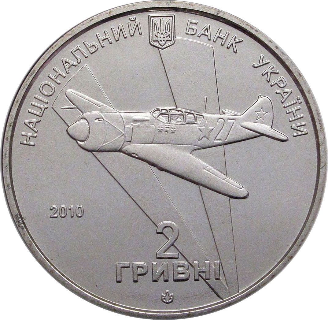 Описание: Вгорі — малий герб України з напівкруглим написом (Національний банк України), внизу — номінал монети (2 гривні) та логотип Монетного двору Національного банку України, ліворуч — рік випуску монети 2010; у центрі зображено літак Ла-7 (боковий номер 27) з прожектором, пілотом якого був І.М.Кожедуб.