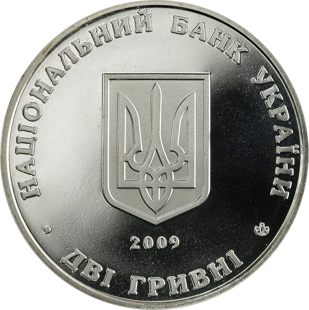 Описание: На монете изображены: малый герб Украины в центре, год выпуска монеты 2009 под ним, две полукруглые надписи — (Национальный банк Украины) вверху и номинал (две гривны) внизу вместе с логотипом Монетного двора Национального банка Украины.