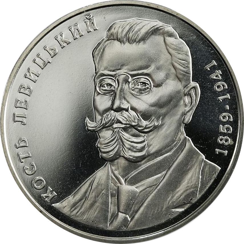 Описание: Справа изображен портрет Костя Левицкого, указаны годы его жизни 1859-1941, а слева — полукруглая надпись КОСТЬ ЛЕВИЦЬКИЙ (Kost’ Levytskyi).