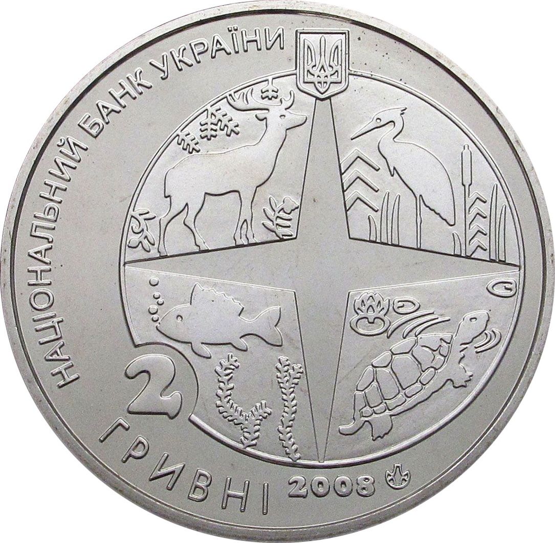 Описание: На монете изображен круг, разделенный розой ветров на четыре части, символизирующие классы млекопитающих, птиц, рыб и амфибий, которые представлены в зоопарке; выше находится небольшой герб Украины и надписи: НАЦІОНАЛЬНИЙ БАНК УКРАЇНИ (Национальный банк Украины) (слева, полукругом), внизу: 2/ ГРИВНІ 2008 (2/гривны 2008) и логотип Монетного двора НБУ.