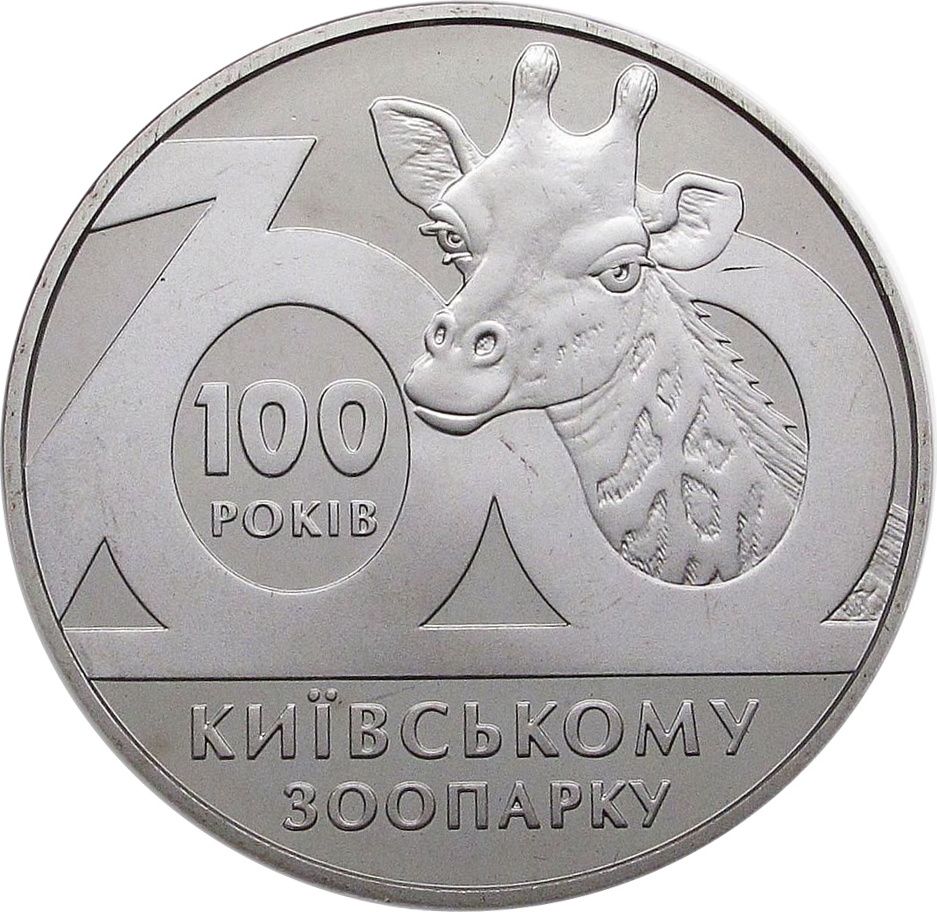 Описание: На монете имеется условная надпись: ZOO, внутри которой изображена жираф и надписи: 100/років (100 лет), КИЇВСЬКОМУ ЗООПАРКУ (Киевскому зоопарку).