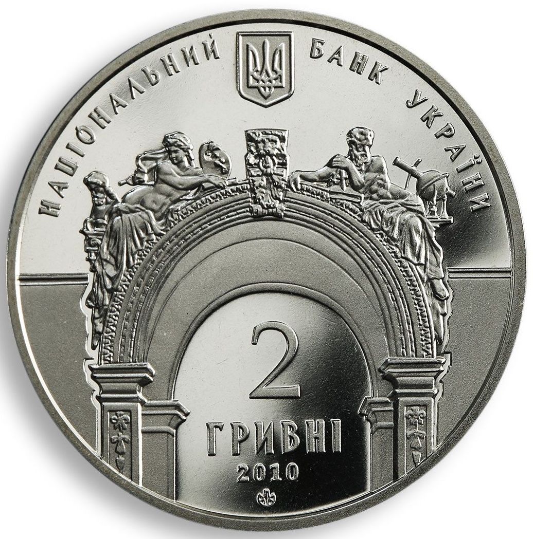 Описание: На монеті зображено: малий герб України та напівкруглий напис НАЦІОНАЛЬНИЙ БАНК УКРАЇНИ (Національний банк України) (вгорі); алегоричні скульптури, що символізують науки та мистецтво і розташовані на головній будівлі університету; номінал монети та рік випуску: 2/ГРИВНI/2010 (2 гривні / 2010) та логотип Монетного двору Національного банку України.