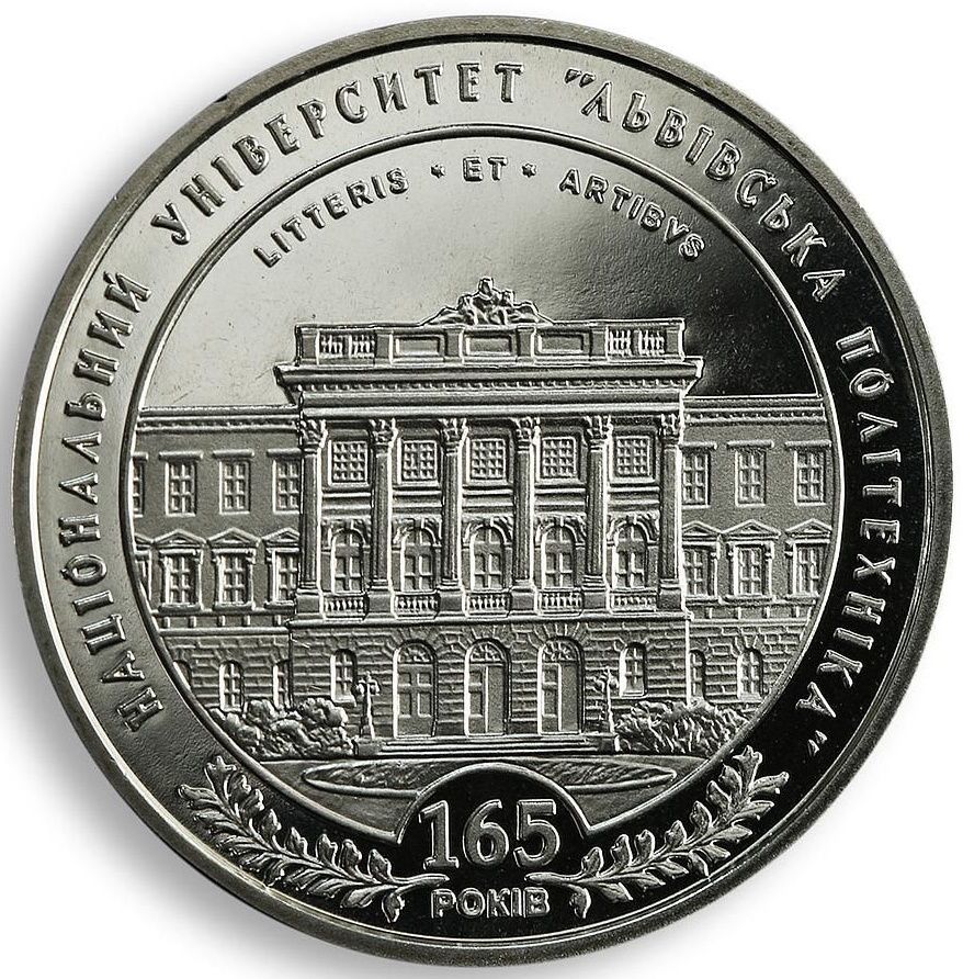 Описание: На монеті зображено головний корпус університету, зведений в останній третині XIX століття за проектом архітектора Юліана Захаревича. Над будівлею розміщено напис у формі дуги LITTERIS*ET*ARTIBUS (для наук і мистецтв), який існує на самій будівлі. Також є круговий напис (Національний університет «Львівська політехніка») і легенда (165 років) нижче.