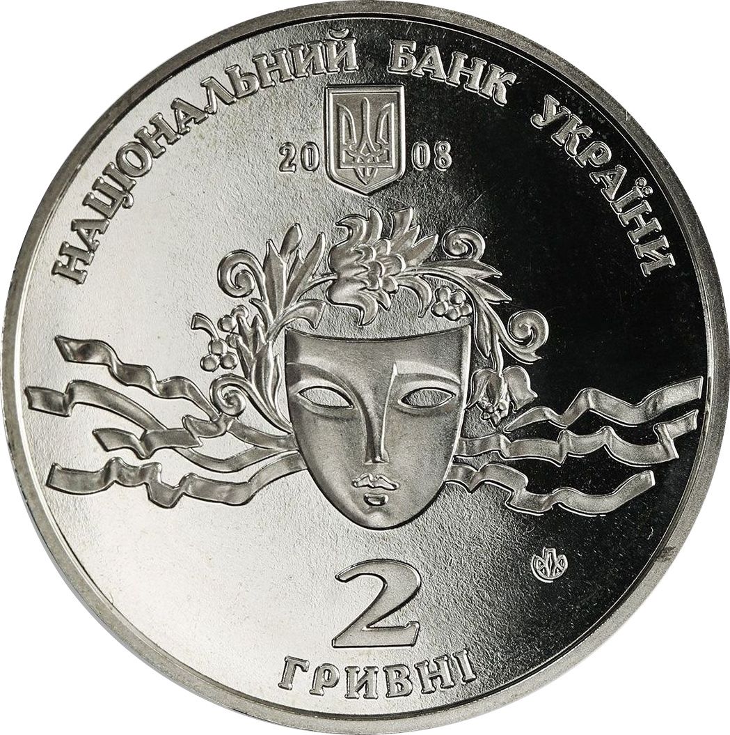 Описание: На монете изображена театральная маска; вверху — полукруглая надпись «Національний банк України» (Национальный банк Украины) с малым гербом Украины и годом выпуска монеты «2008» под ним; внизу — надпись «2/ГРИВНІ» (2/гривны) и логотип Монетного двора Национального банка Украины.