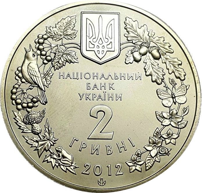 Описание: Усередині вінка, утвореного зображеннями різних видів флори і фауни, розміщено малий герб України та написи: НАЦІОНАЛЬНИЙ/ БАНК /УКРАЇНИ/ 2/ ГРИВНІ/ 2012 (Національний / Банк / України / 2 / гривні / 2012, нижче розміщено логотип Монетного двору Національного банку України.