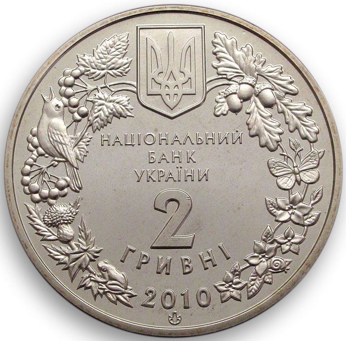 Описание: Маленький герб України в орнаментальному вінку, утвореному зображеннями деяких видів флори і фауни, разом з написами «НАЦІОНАЛЬНИЙ/ БАНК / УКРАЇНИ / 2 / ГРИВНІ / 2010» (Національний / Банк / України / 2 / гривні) і логотипом Монетного двору Національного банку України зверху.