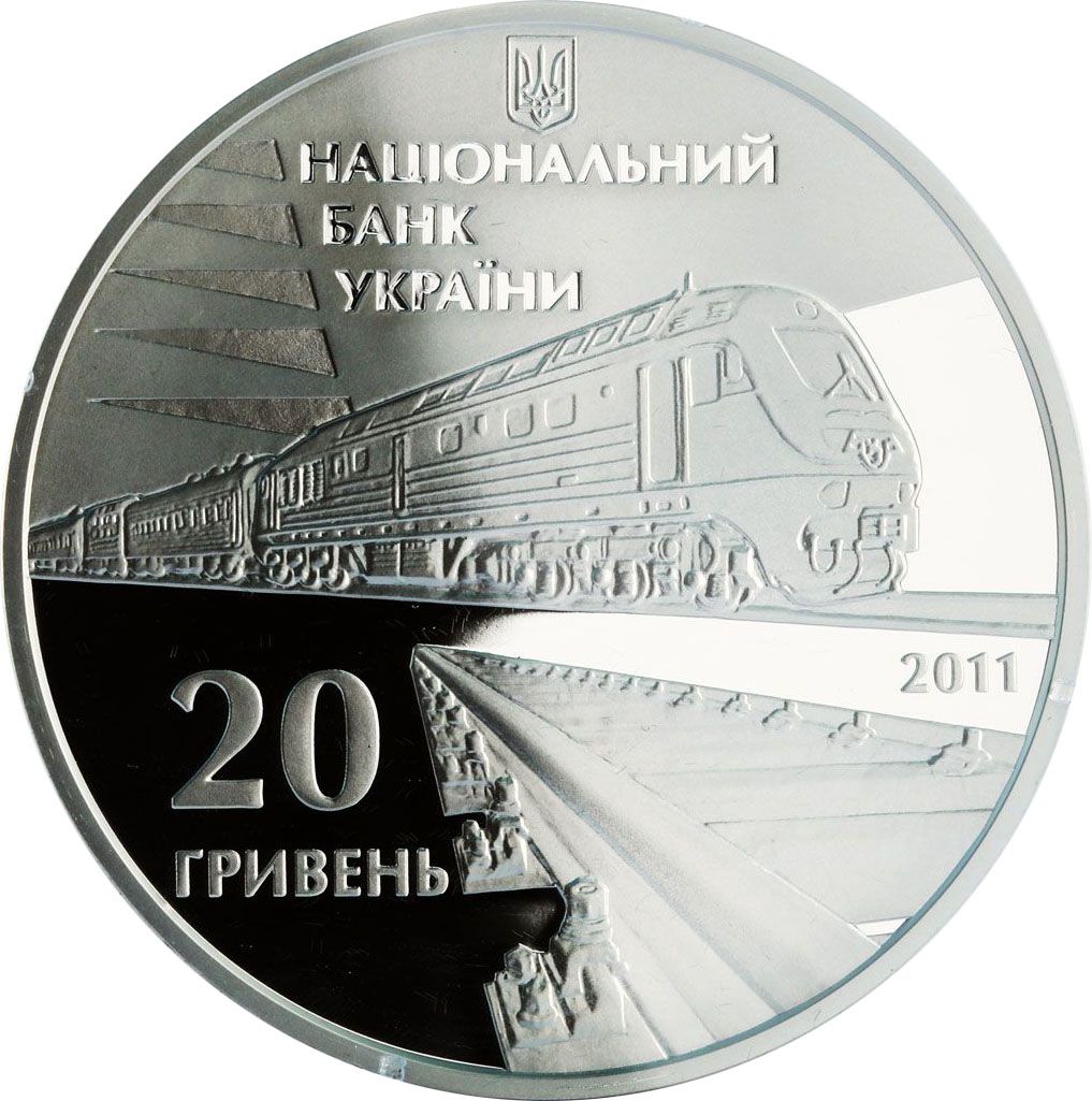 Описание: Зверху розміщено малий герб України з написом НАЦІОНАЛЬНИЙ / БАНК / УКРАЇНИ (Національний / Банк / України); на темному тлі зображено сучасний швидкісний поїзд Українських залізниць та частину залізничної колії; ліворуч вказано номінал монети 20/ГРИВЕНЬ (20/гривень), а праворуч — рік випуску монети 2011.