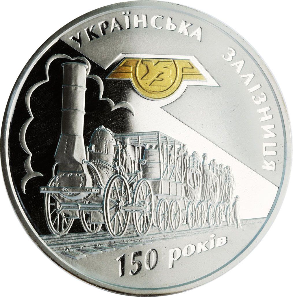 Описание: На монеті зображено один із перших поїздів українських залізниць; зверху — напівкруглий напис «УКРАЇНСЬКА ЗАЛІЗНИЦЯ» з логотипом компанії «Українські залізниці» (Укрзалізниця) під ним; знизу — напис «150 РОКІВ».