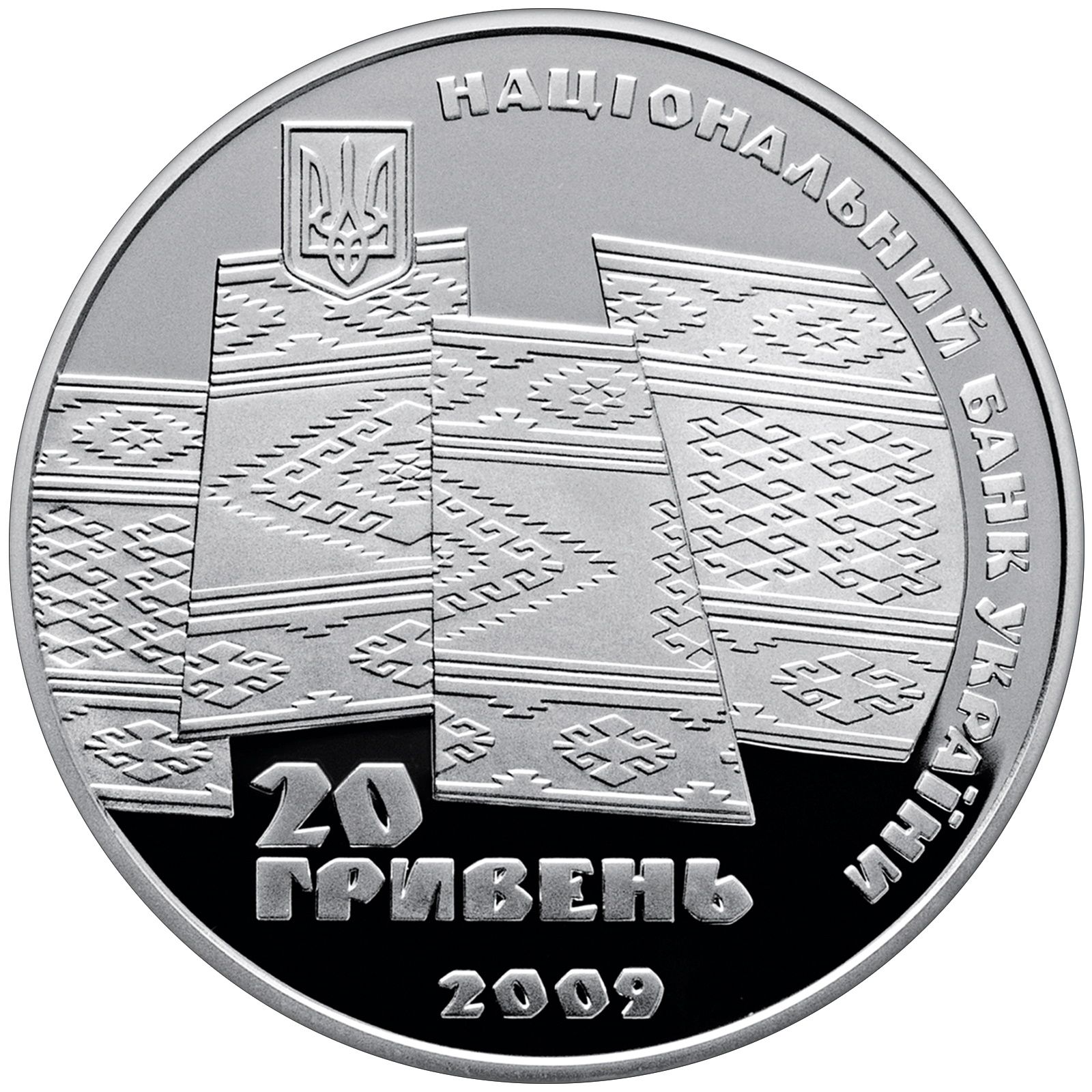 Описание: На монеті зображено килими з традиційними карпатськими орнаментами, а також малий герб України (вгорі) і напівкруглий напис «Національний банк України» (National Bank of Ukraine) праворуч; внизу вказано номінал 20/ГРИВЕНЬ (20/Hryvnias) і рік випуску монети 2009 разом з логотипом Монетного двору Національного банку України (зліва).