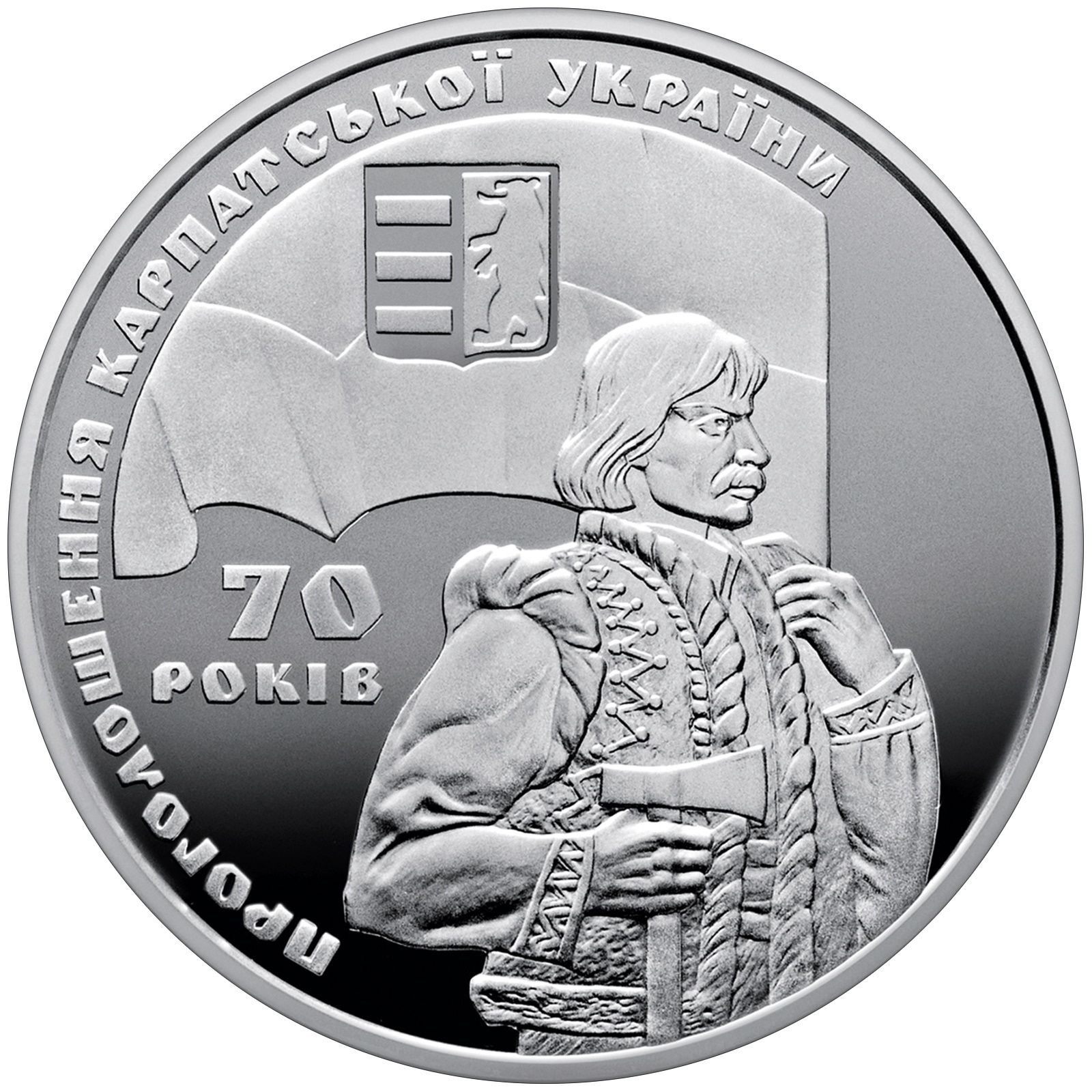 Описание: На монеті зображено закарпатця, який тримає прапор з гербом Карпатської України; під прапором є напис: 70/РОКІВ (70/РОКІВ), а ліворуч — напівкруглий напис: ПРОГОЛОШЕННЯ КАРПАТСЬКОЇ УКРАЇНИ (Проголошення Карпатської України).