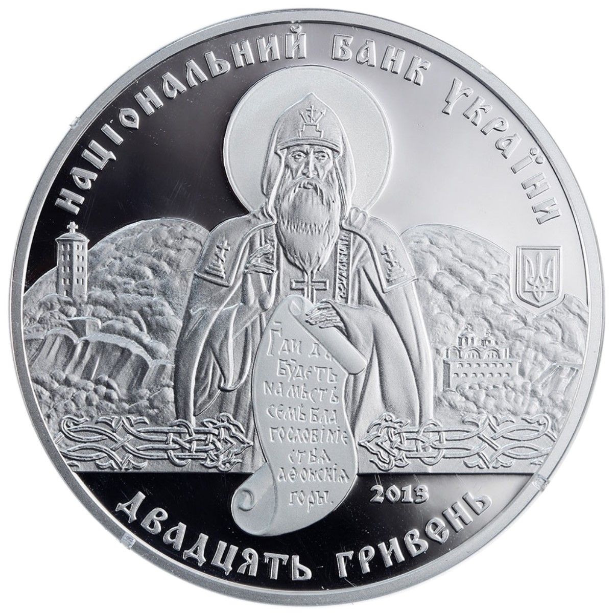 Описание: Зверху розміщено напівкруглий напис НАЦІОНАЛЬНИЙ БАНК УКРАЇНИ; праворуч — малий герб України, рік випуску монети 2013 та стилізована композиція з Антонієм Печерським у центрі на тлі скель, що нагадують крила; внизу – давньоруський орнамент і напівкругла легенда ДВАДЦЯТЬ ГРИВЕНЬ (TWENTY HRYVNIAS).