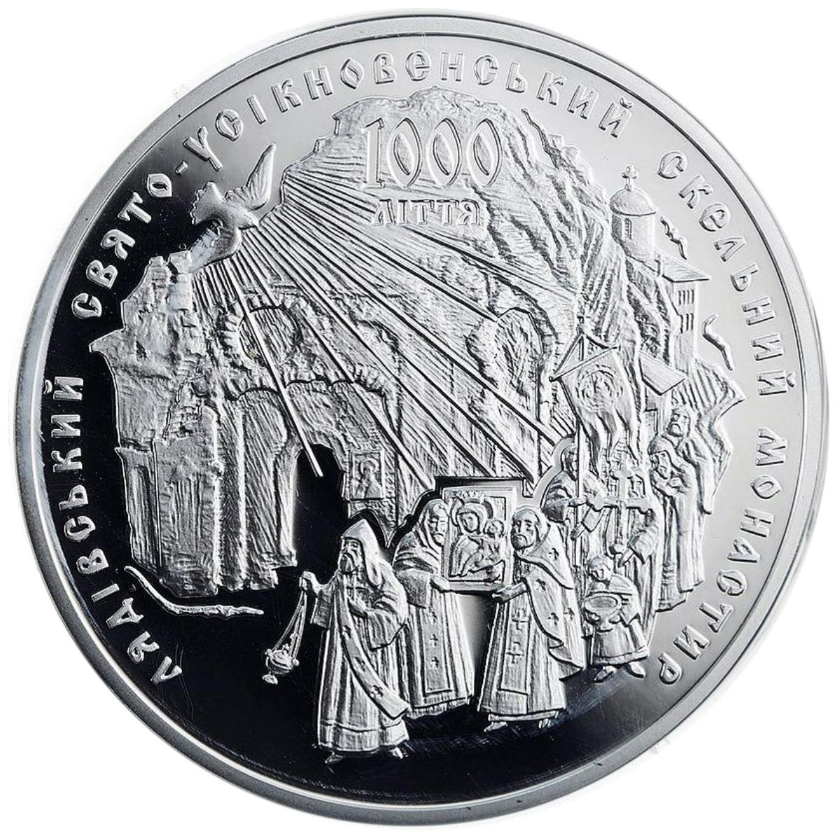 Описание: Є композиція, що складається зі стилізованого фрагмента Печерського монастиря, хресної процесії ченців і паломників, голуба (зліва, вгорі) та променів, що символізують Святого Духа. На монеті є кругла легенда ЛЯДІВСЬКИЙ СВЯТО-УСІКНОВЕНСЬКИЙ СКЕЛЬНИЙ МОНАСТИР (ЛЯДІВСЬКИЙ СВЯТО-УСІКНОВЕНСЬКИЙ СКЕЛЯНИЙ МОНАСТИР).