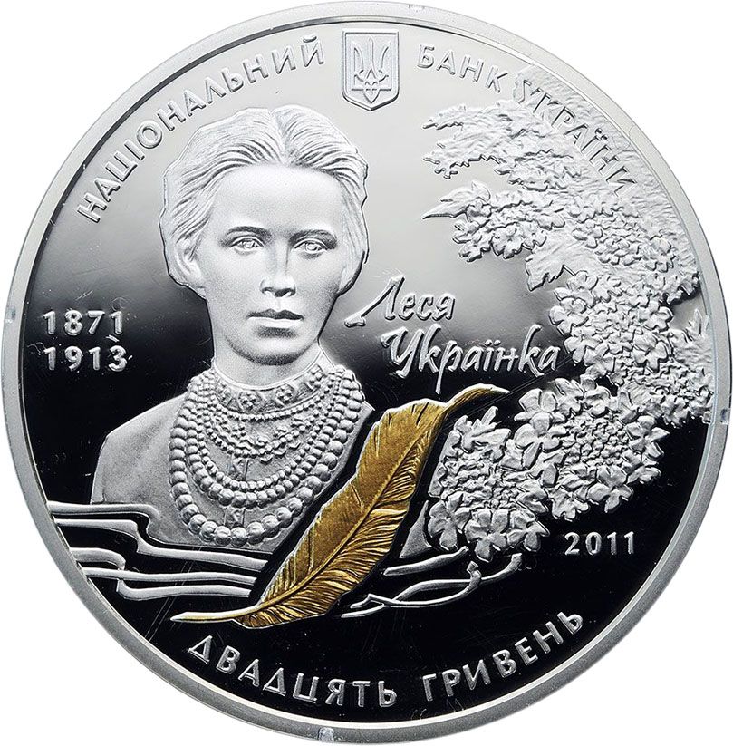Описание: Зверху розміщено малий герб України з напівкруглим написом НАЦІОНАЛЬНИЙ БАНК УКРАЇНИ (Національний банк України); ліворуч — портрет Лесі Українки з зазначенням років її життя 1871/1913 та позолочене перо з написом ЛЕСЯ/УКРАЇНКА»; праворуч зображено гілку калини з позначенням року випуску монети «2011»; внизу – номінал монети «ДВАДЦЯТЬ ГРИВЕНЬ».