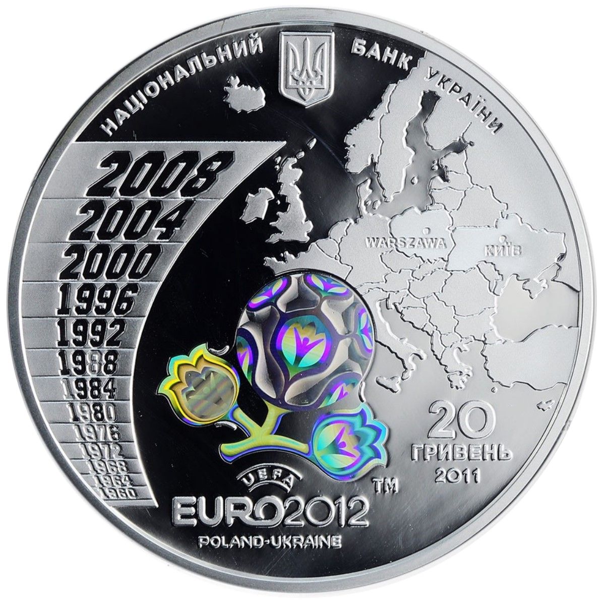 Описание: На монеті зображено: малий герб України з напівкруглим написом НАЦІОНАЛЬНИЙ БАНК УКРАЇНИ (Національний банк України), карта Європи з написами КИЇВ (Київ) та WARSZAWA (Варшава), на тлі якої зображено голографічне зображення офіційного логотипу UEFA Euro 2012 з написами під ним UEFA/EURO 2012TM/POLAND-UKRAINE; зліва перелічені роки попередніх чемпіонатів Європи з футболу, починаючи з 1960 року; праворуч – номінал монети та рік випуску 20/ГРИВЕНЬ/2011 (20/гривень/2011).