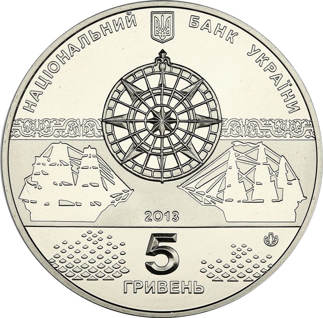 Описание: Зверху розміщений малий герб України з напівкруглим написом НАЦІОНАЛЬНИЙ БАНК УКРАЇНИ (Національний банк України); у центрі зображено розу вітрів як символ морських подорожей з узагальненими рослинними орнаментами та вітрильними суднами ліворуч і праворуч від неї; між ними зазначено рік випуску монети — 2013; нижче вказано номінал: 5/ГРИВЕНЬ (5/гривень); праворуч — знак Монетного двору Національного банку України.
