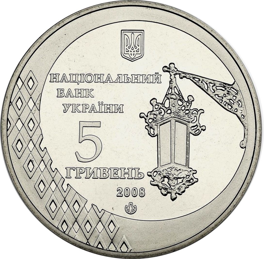 Описание: Зображено ліхтар-фрет (праворуч), один із символів міста, фрагмент стилізованого орнаменту (ліворуч), який прикрашає дах Чернівецького університету, а над ним: малий Державний герб України та написи: НАЦІОНАЛЬНИЙ/ БАНК/ УКРАЇНИ/ 5/ ГРИВЕНЬ/ 2008 (Національний банк України/ 5/ Гривня/ 2008) та логотип Монетного двору НБУ.