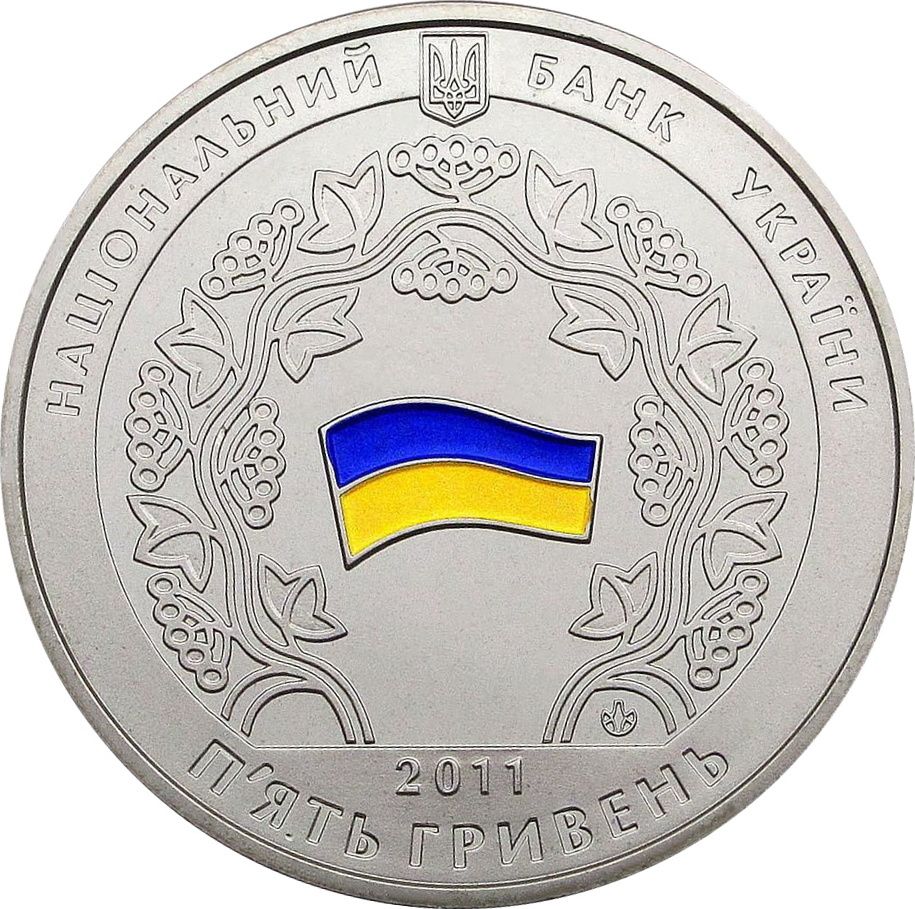 Описание: Малий герб України та напівкруглий напис НАЦІОНАЛЬНИЙ БАНК УКРАЇНИ (Національний банк України) (вгорі); внизу — рік випуску монети та номінал 2011 П'ЯТЬ ГРИВЕНЬ (п'ять гривень) з логотипом Монетного двору Національного банку України праворуч; у центрі — Державний прапор України (декоративний елемент — емаль) у стилізованому віночку з калини.