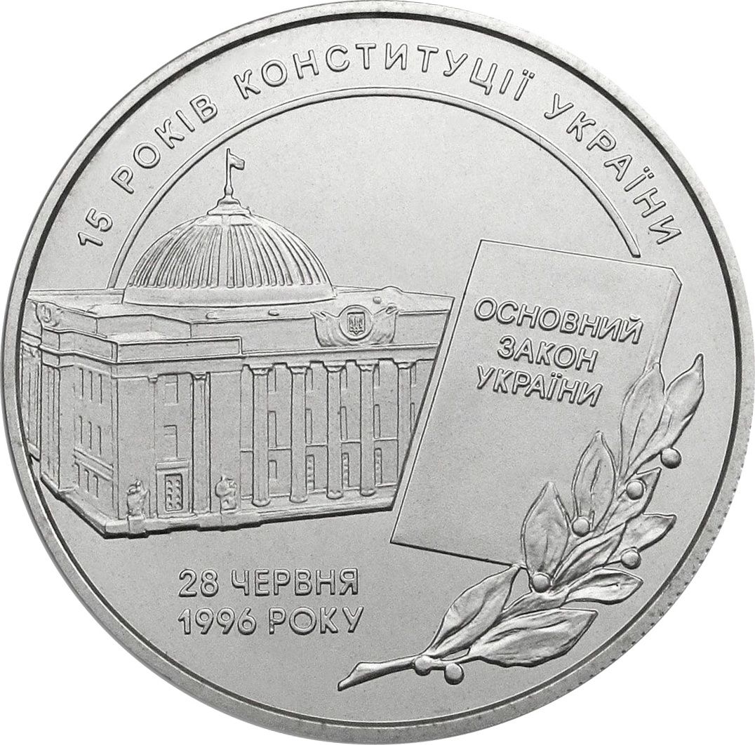 Описание: На монеті зображено книгу «ОСНОВНИЙ ЗАКОН УКРАЇНИ» на тлі будівлі Верховної Ради, де була прийнята Конституція; на передньому плані зображено лаврову гілку. На реверсі монети розміщено написи: напівкруглий над 15 РОКІВ КОНСТИТУЦІЇ УКРАЇНИ (15 років Конституції України) та нижче ліворуч 28 ЧЕРВНЯ 1996 РОКУ (28 червня 1996 року).