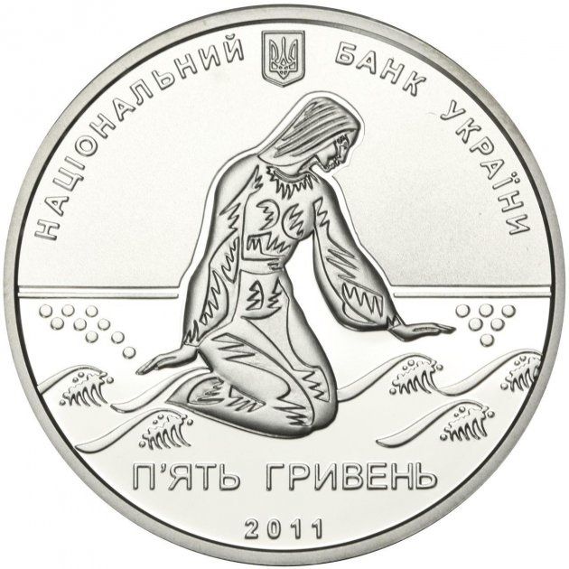 Описание: Зверху розміщено малий герб України з напівкруглим написом НАЦІОНАЛЬНИЙ БАНК УКРАЇНИ (Національний банк України); внизу — стилізована композиція, що символізує творчість Дніпровської Чайки та зображує дівчину біля моря; нижче — напис із зазначенням номіналу монети та року випуску П'ЯТЬ ГРИВЕНЬ /2011 (п'ять гривень / 2011).