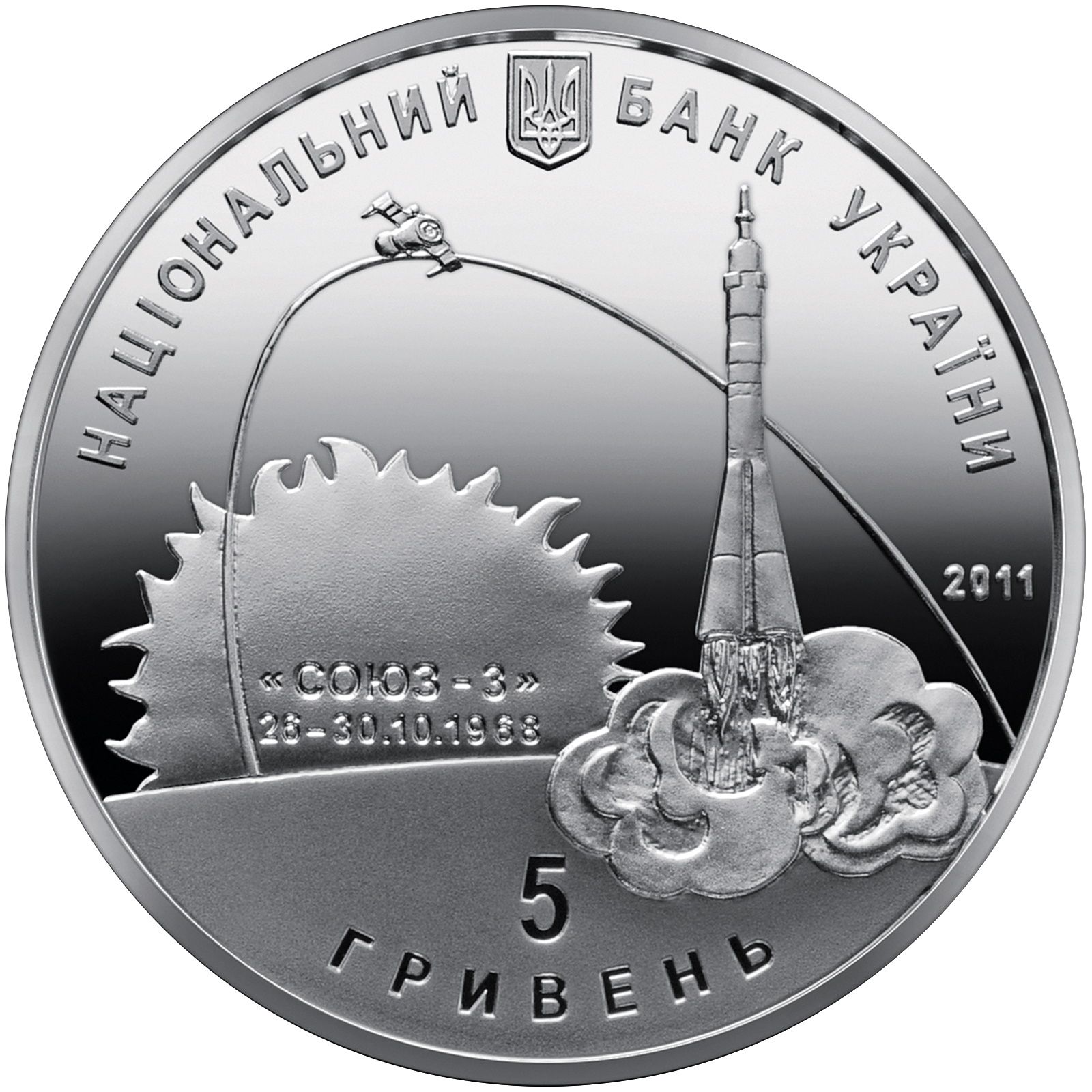 Описание: Вверху находится малый герб Украины с полукружной надписью НАЦІОНАЛЬНИЙ БАНК УКРАЇНИ (Национальный банк Украины); внизу — стилизованная композиция, изображающая запуск космического корабля «Союз 3», летящего для стыковки с беспилотным космическим кораблем «Союз 2» в тени Земли, вместе со следующими надписями: «Союз 3» (Союз 3)/26-30.10.1968 слева; 2011 справа (указание года выпуска монеты) и 5/ГРИВЕНЬ (5/гривен) внизу (номинал монеты).