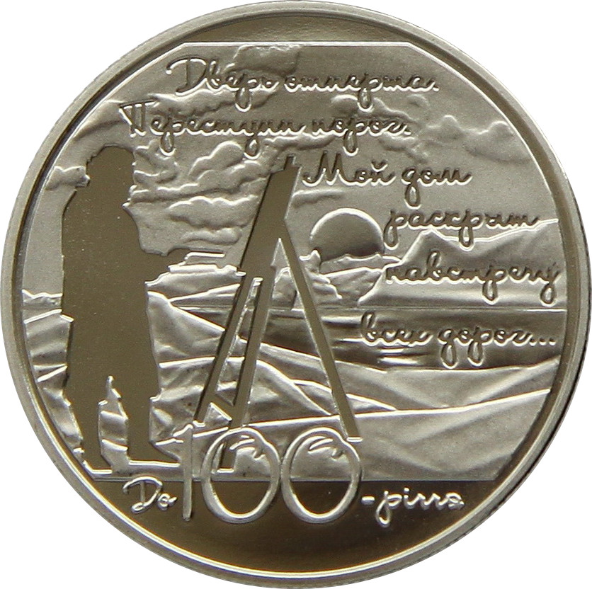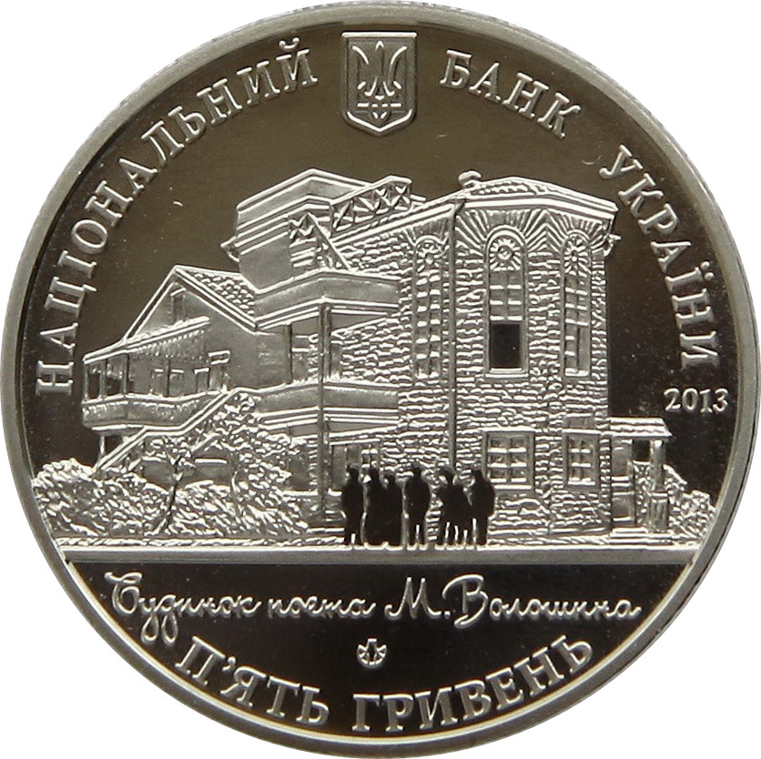 Описание: Малий герб України та напівкруглий напис НАЦІОНАЛЬНИЙ БАНК УКРАЇНИ (Національний банк України) (вгорі); у центрі зображено Будинок поета з силуетами людей перед ним, що символізують «гостинність» резиденції доброго господаря; під ним – напис БУДИНОК ПОЕТА М.ВОЛОШИНА (Будинок поета М.Волошина) з праворуч від нього зазначенням року випуску монети 2013; нижче – знак Монетного двору Національного банку України та номінал монети П'ЯТЬ ГРИВЕНЬ (п'ять гривень).