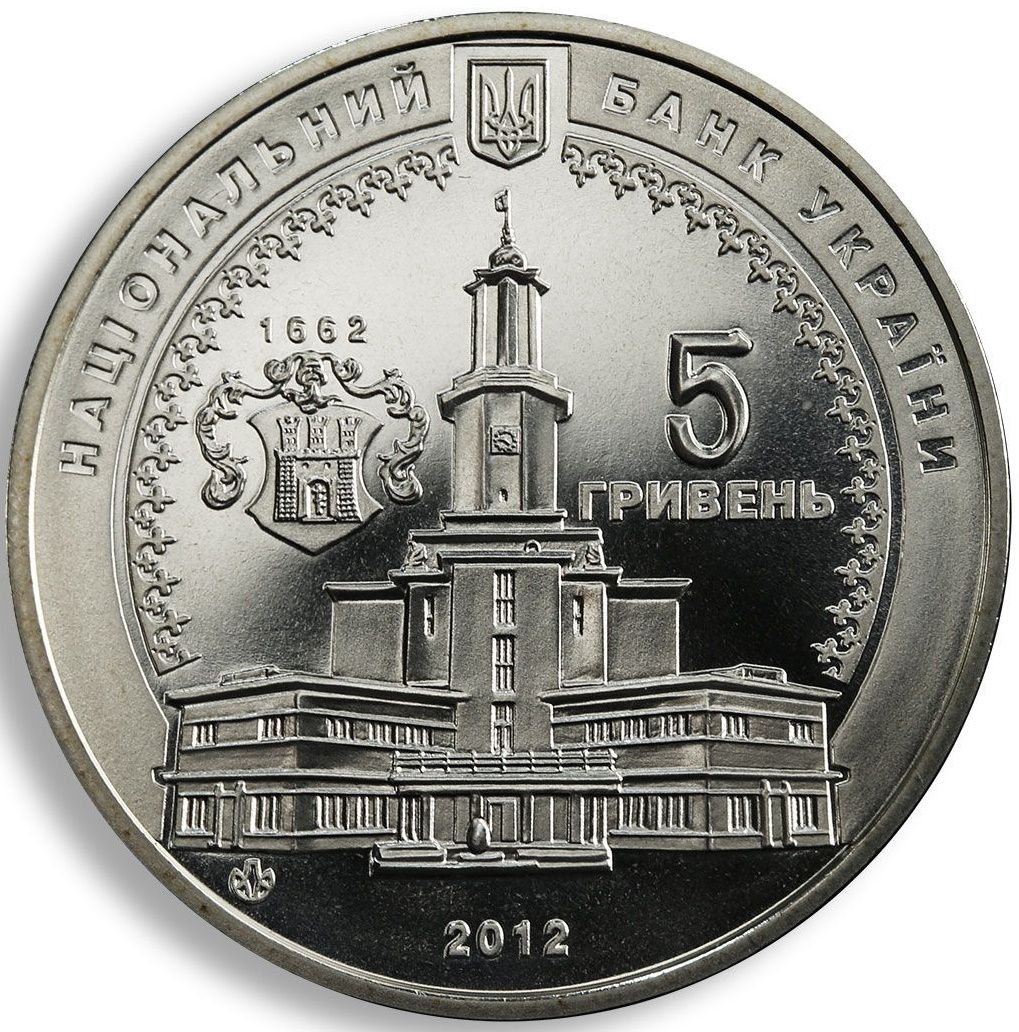 Описание: На монеті зображено малий герб України та напівкруглий напис: НАЦІОНАЛЬНИЙ БАНК УКРАЇНИ (National Bank of Ukraine); у центрі зображено будівлю Ратуші, ліворуч від якої розміщено герб міста та напис 1662; нижче вказано рік випуску монети 2012; праворуч від зображення Ратуші вказано номінал — 5/ГРИВЕНЬ (5 гривень).