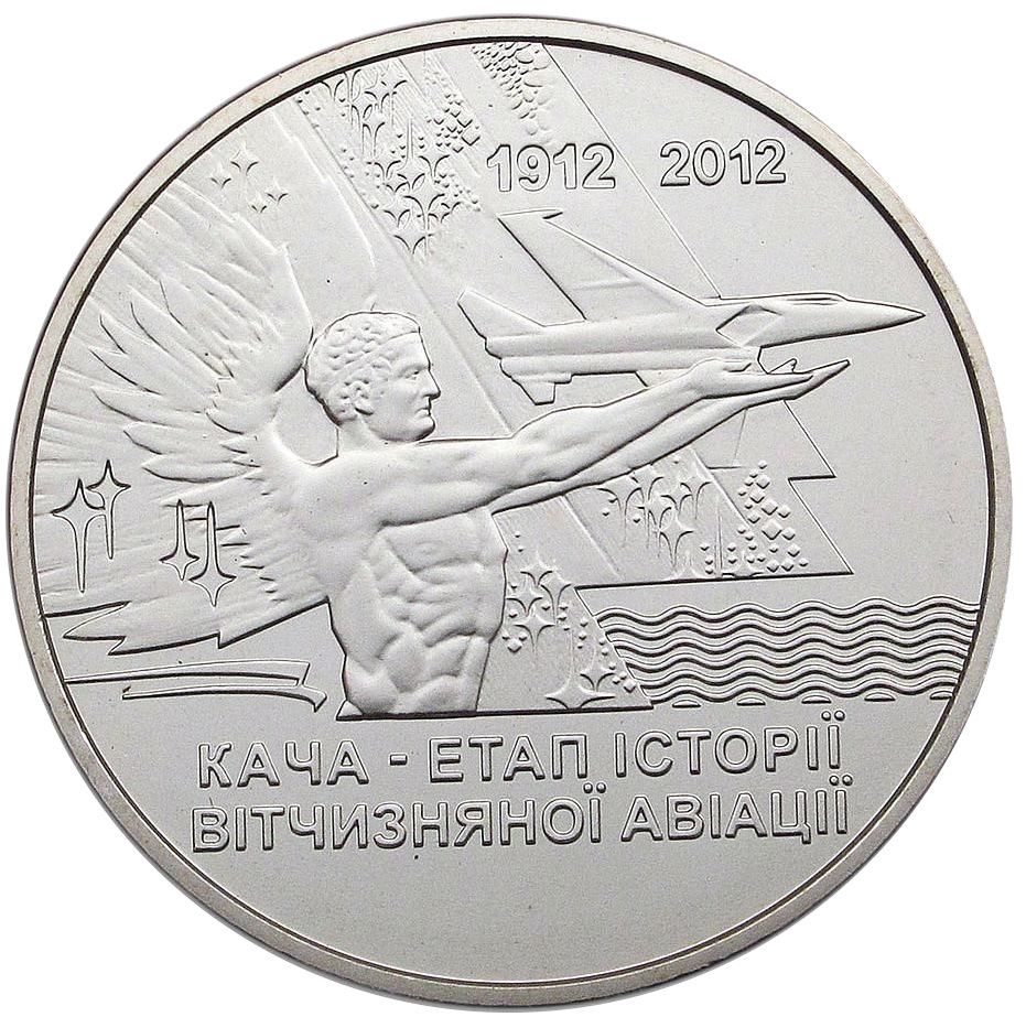 Описание: Зверху зображено малий герб України та напівкруглий напис: НАЦІОНАЛЬНИЙ/БАНК/УКРАЇНИ (Національний банк України); ліворуч — рік випуску монети — 2012, під ним — логотип Національного банку України; у центрі — герб Качі; праворуч, на тлі карти аеродрому, — напис: 5 ГРИВЕНЬ (5 гривень).