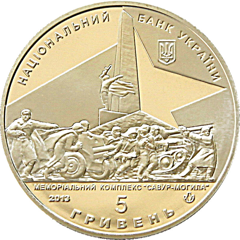 Описание: Зверху розміщено напівкруглий напис НАЦІОНАЛЬНИЙ БАНК УКРАЇНИ (Національний банк України) з малим гербом України під ним праворуч; у центрі зображено меморіал воїнам-визволителям з назвою під ним МЕМОРІАЛЬНИЙ КОМПЛЕКС «САВУР-МОГИЛА» (Меморіальний комплекс «Савур-Могила»); нижче – рік випуску монети 2013 (зліва) та номінал: 5/ГРИВЕНЬ (5 гривень) разом із знаком Монетного двору Національного банку України (праворуч).