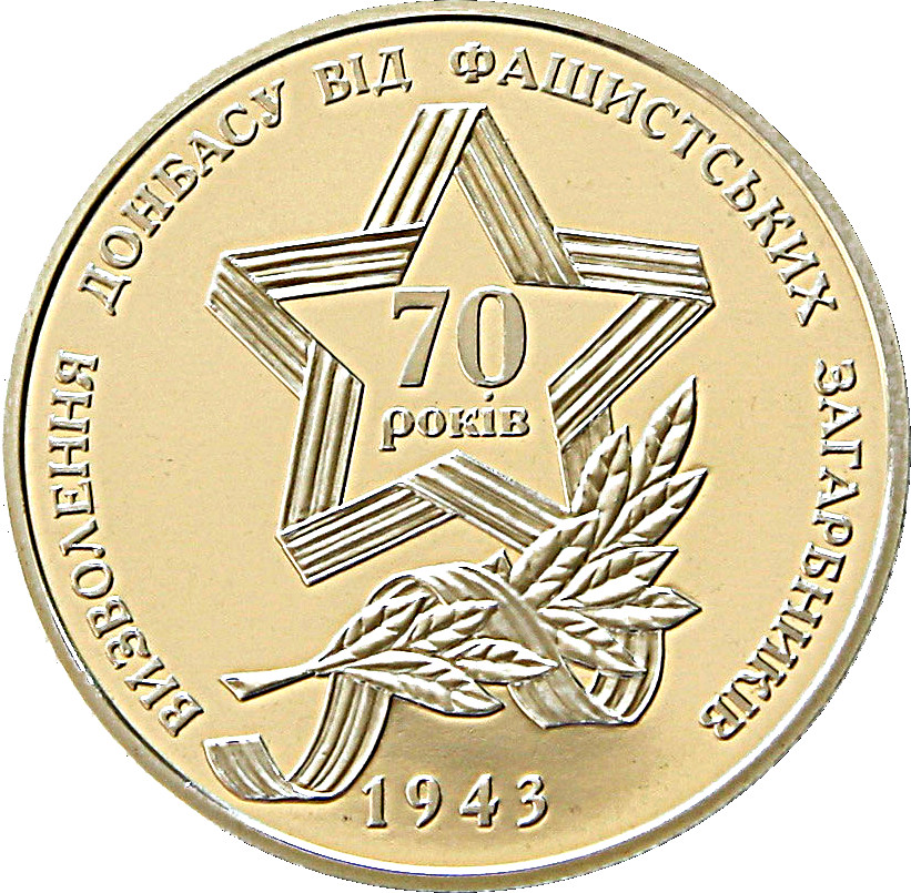 Описание: На дзеркальному тлі зображено композицію: зірку з написом 70/років (70/років) і лаврову гілку; також є напис ВИЗВОЛЕННЯ ДОНБАСУ ВІД ФАШИСТСЬКИХ ЗАГАРБНИКІВ (Звільнення Донбасу від фашистських загарбників) та напис 1943 (внизу).