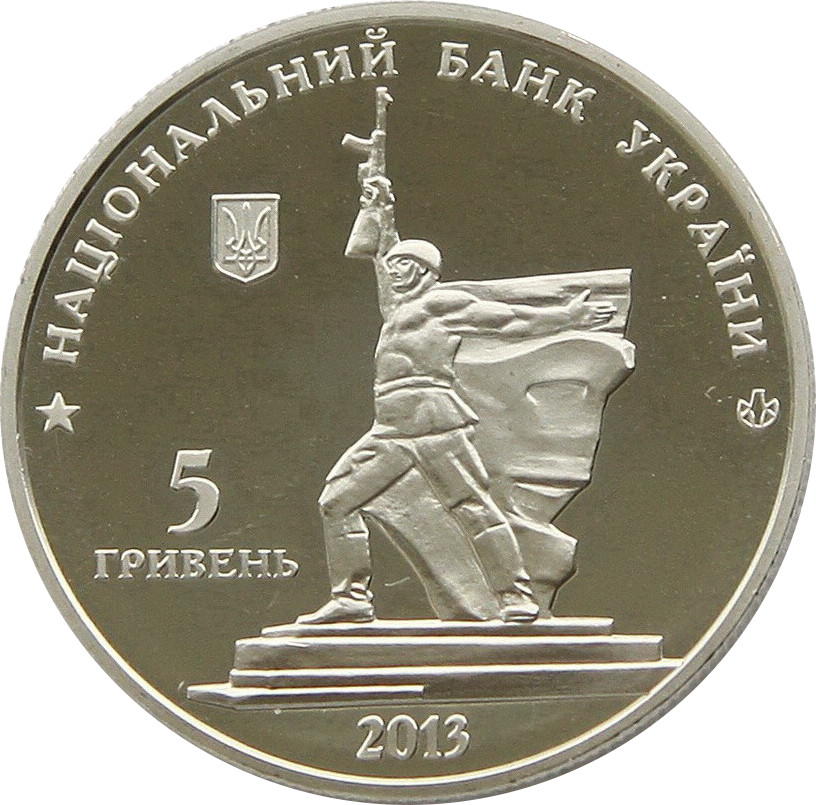 Описание: Зверху розміщено напівкруглий напис НАЦІОНАЛЬНИЙ БАНК УКРАЇНИ (Національний банк України) з малим гербом України під ним ліворуч; у центрі зображено пам'ятник воїну-визволителю, що прикрашає місто; під ним вказано рік випуску монети 2013; ліворуч — номінал монети: 5 ГРИВЕНЬ (5 гривень); праворуч — знак Монетного двору Національного банку України.