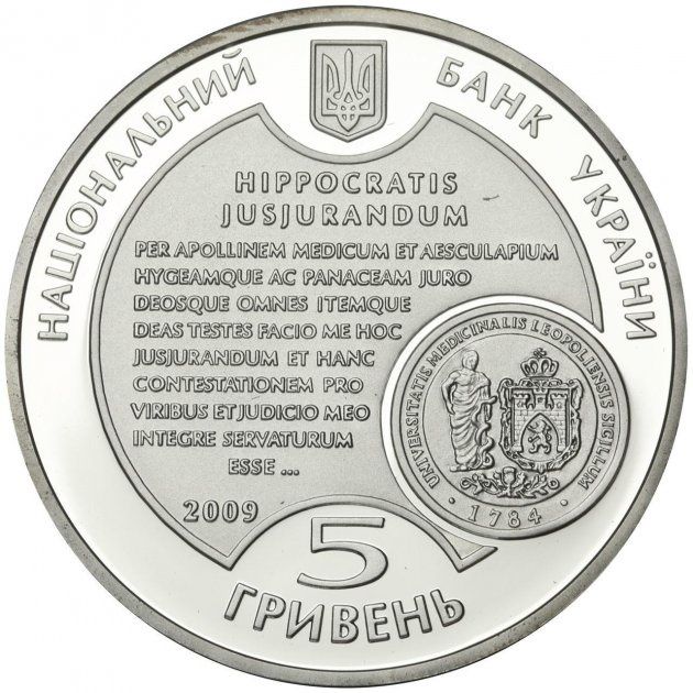 Описание: Зверху розміщено малий герб України з напівкруглим написом НАЦІОНАЛЬНИЙ БАНК УКРАЇНИ (Національний банк України); внизу — номінал монети 5/ГРИВЕНЬ (5/гривень), а в центрі, на темному тлі, — перші рядки Клятви Гіппократа латиною; під ними ліворуч — позначення року випуску монети 2009, а праворуч — емблема університету.