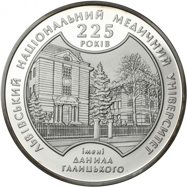 Описание: На монеті зображено будівлю університету серед написів: зверху 225/РОКІВ (225/років), знизу ІМЕНІ/ДАНИЛА/ГАЛИЦЬКОГО (названо на честь/Данила/Галицького) та круговий напис ЛЬВІВСЬКИЙ НАЦІОНАЛЬНИЙ МЕДИЧНИЙ УНІВЕРСИТЕТ (Львівський національний медичний університет).