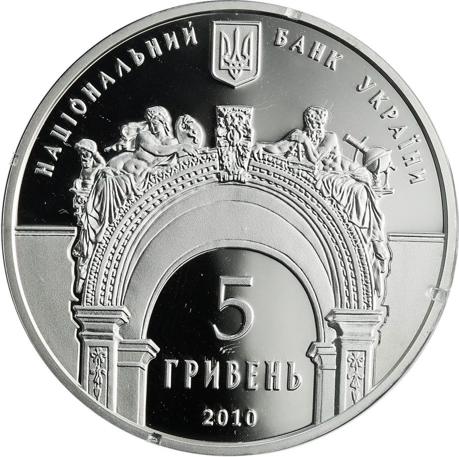 Описание: На монеті зображено: малий герб України та напівкруглий напис НАЦІОНАЛЬНИЙ БАНК УКРАЇНИ (Національний банк України) (вгорі); алегоричні скульптури, що символізують науки та мистецтва і розташовані на головній будівлі університету; номінал монети та рік випуску: 5/ГРИВЕНЬ/2010 (5 / гривень / 2010) та логотип Монетного двору Національного банку України.